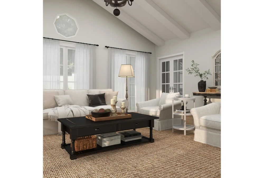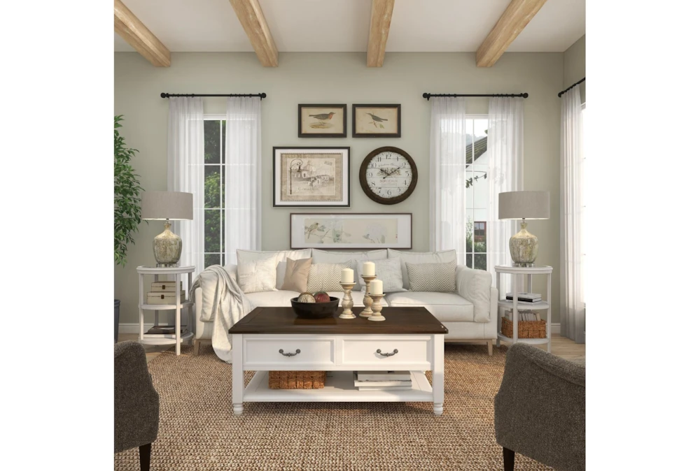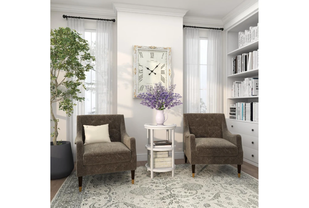 Place this graceful accent table by your seat, and you’ll have plenty of shelving to keep essentials in reach. In addition to a glass top for drinks and snacks, the design features pierced wood shelves for holding books, décor and more. Made of wood and metal, it’s finished in white for a charming, versatile look.
