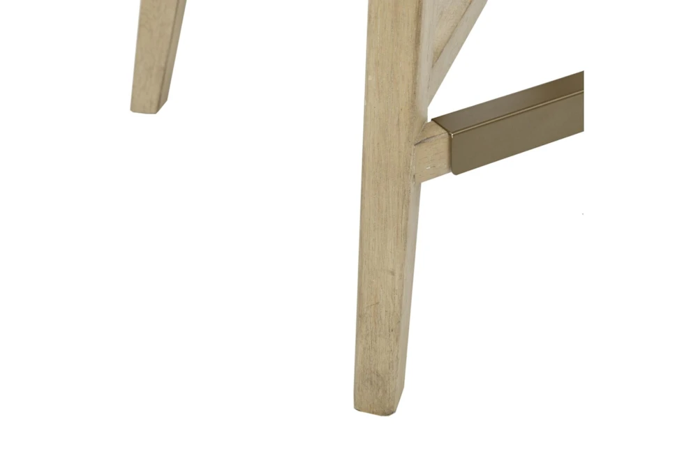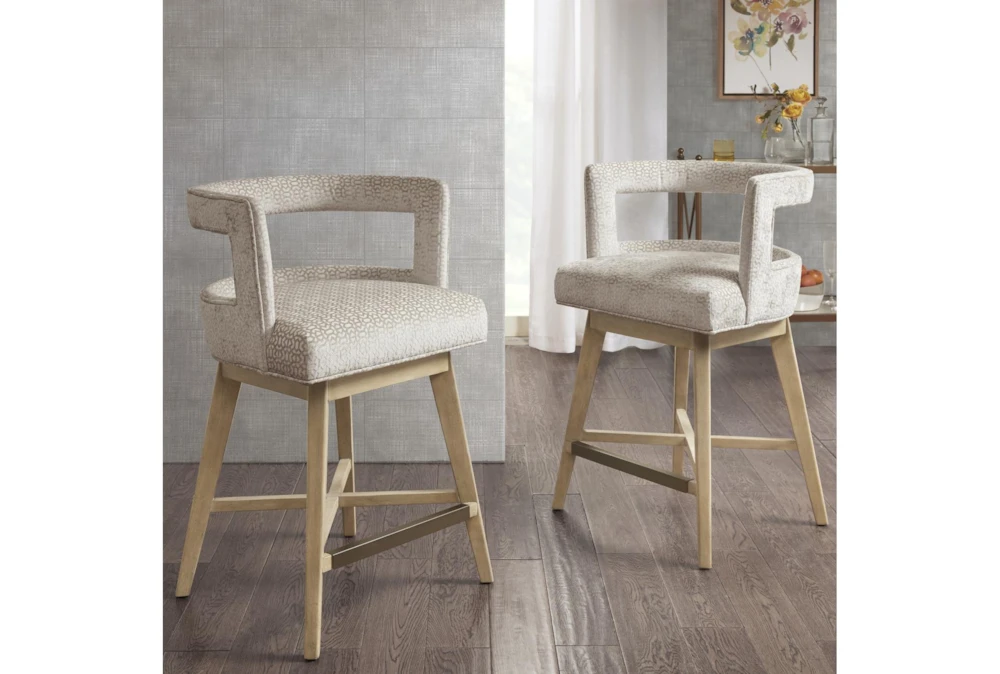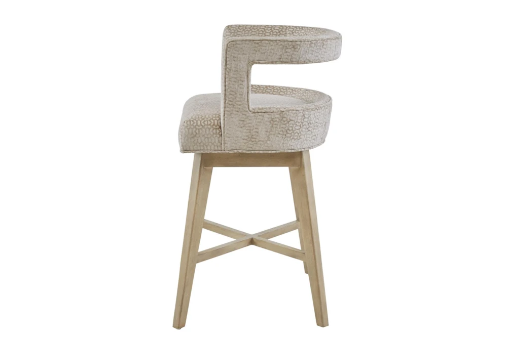 This Adrian 25″ Swivel Counter Stool is a contemporary style stool made of solid wood and polyester with a cushioned seat, swivel feature, and metal kickplate. Assembly is required and the stool comes in a natural wheat color with a bronze metal finish.