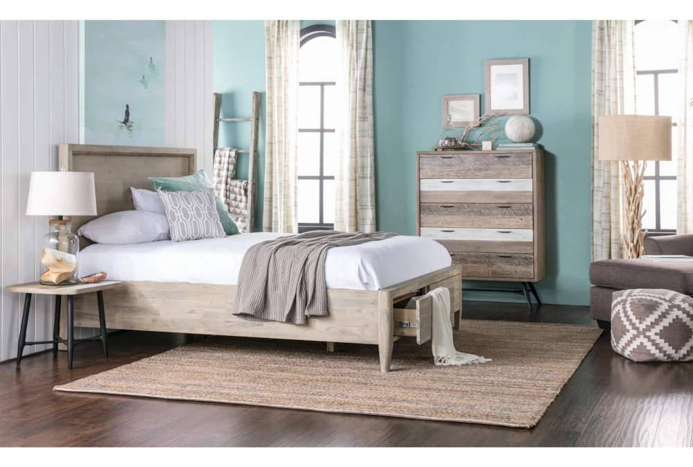 A clever addition to the popular Allen collection, this storage bed will save space and add style. Inspired by the crisp, timeless mid-century look, the solid acacia and veneer design is finished in a light sandblast wash and includes two footboard drawers that keep clothing and accessories close.