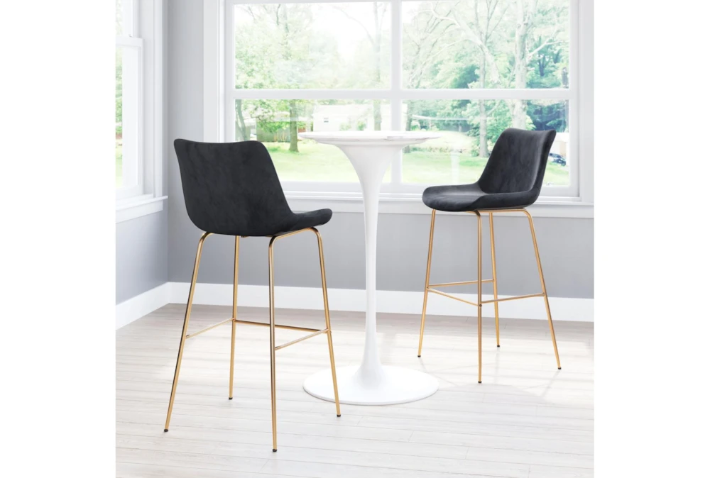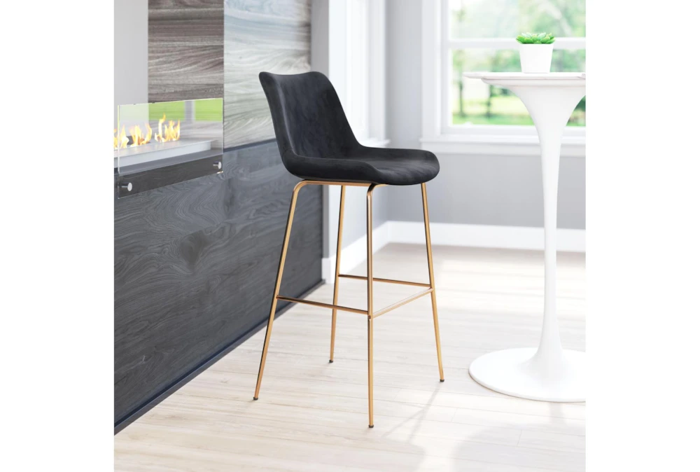The Black Velvet Bucket Bar Stool is a modern-style metal stool for the dining room, featuring an armless design and a back for added support. Assembly is required and the stool is available in black with gold accents, constructed with steel and foam cushioning upholstered in 100% polyester.
