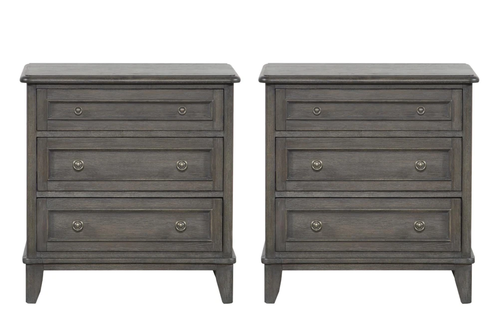 Inviting and elegant, our Candice II 3-drawer nightstand will help you create a comfy, calming, classic space. Crafted to add long-lasting beauty, functionality and quality to your retreat, the design is decked in grey for a fresh yet traditional look. It boasts durable hardwood and oak veneer construction, as well as sturdy drawers, which are reinforced by English dovetail joinery and ball-bearing extension guides. It even has 2 power outlets and 2 USB ports in back for convenient bedside charging.
