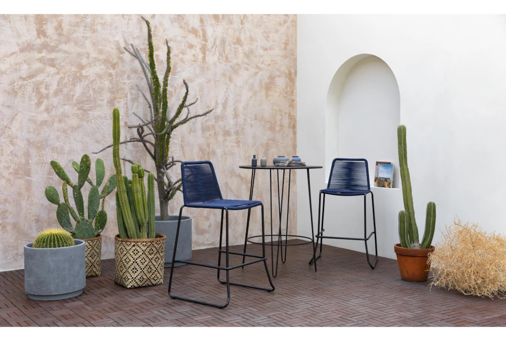 Brimming with on-trend style and ultra-modern flair, our Caspian bar set will transform your backyard into an elevated oasis. Nautical rope – available in 3 cool colors – helps shape a chic and unique bar stool silhouette, while powder-coated galvanized steel creates a sleek, stackable frame. A coordinating bar-height table made of steel is the perfect spot to get your cocktail hour on.