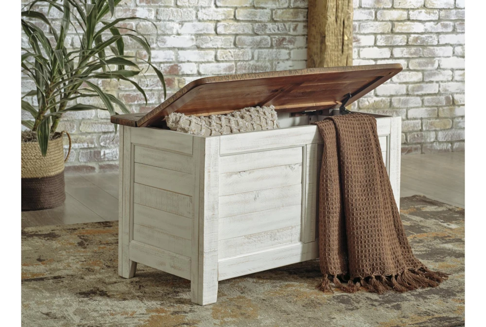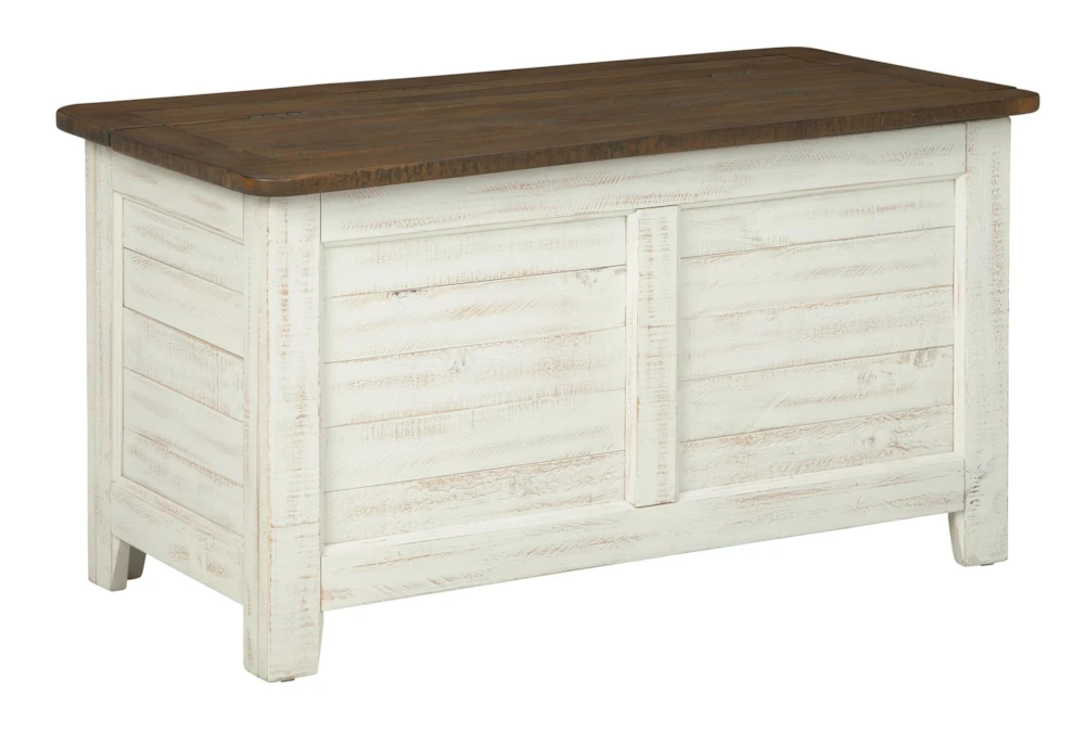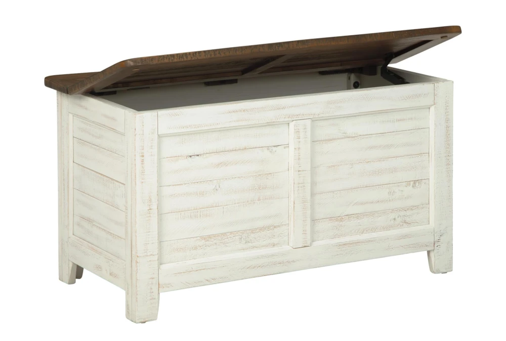 Made of veneer, solide wood, and engineered wood in a distressed white and brown finish. Distressed plank effect on front and sides. Hinged top with storage.