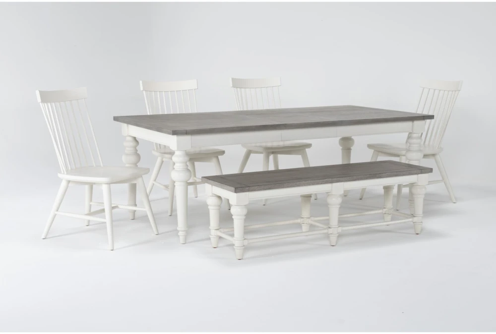To create a warm, welcoming setting, all you need is our Edward dining collection. Friends and family will want to gather for meals and memories when they see these classic Farmhouse-inspired designs. Crafted with solid hardwood and oak veneer, the set includes a grand two-tone table with graceful turned legs, a coordinating bench and white and grey Windsor-style chairs. You can mix, match and make it yours by coming up with your own custom combination. For storing entertaining essentials, there’s a striking sideboard that houses everything.