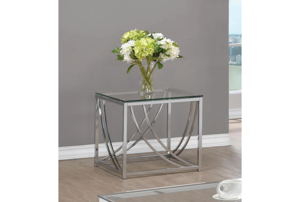 The Elianna End Table is a contemporary piece of furniture with a glass top, made of chrome and clear metal. It is a perfect addition to any living room, with an overall dimension of 19.75″W x 19.75″D x 19.25″H and a weight limit of 110 lbs.