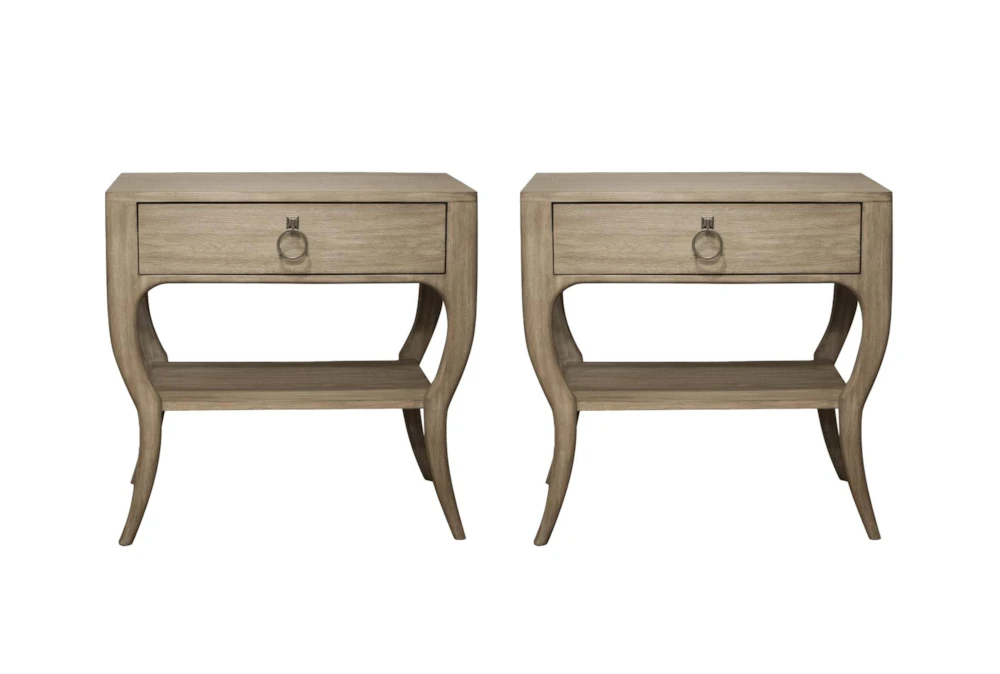 The Esmeralda Nightstand Set includes two traditional style grey wood nightstands with storage and drawers, perfect for a bedroom. Made with hardwood solids and oak veneers, as well as Asian hardwood, these nightstands are durable and stylish.