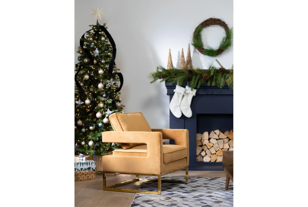 The Evelyn Cognac Velvet Accent Chair is a modern style chair made of 100% polyester fabric in a rich brown color. Handmade by skilled furniture craftsmen, this chair features gold stainless steel legs and a high-density foam seat cushion for comfortable and durable seating.