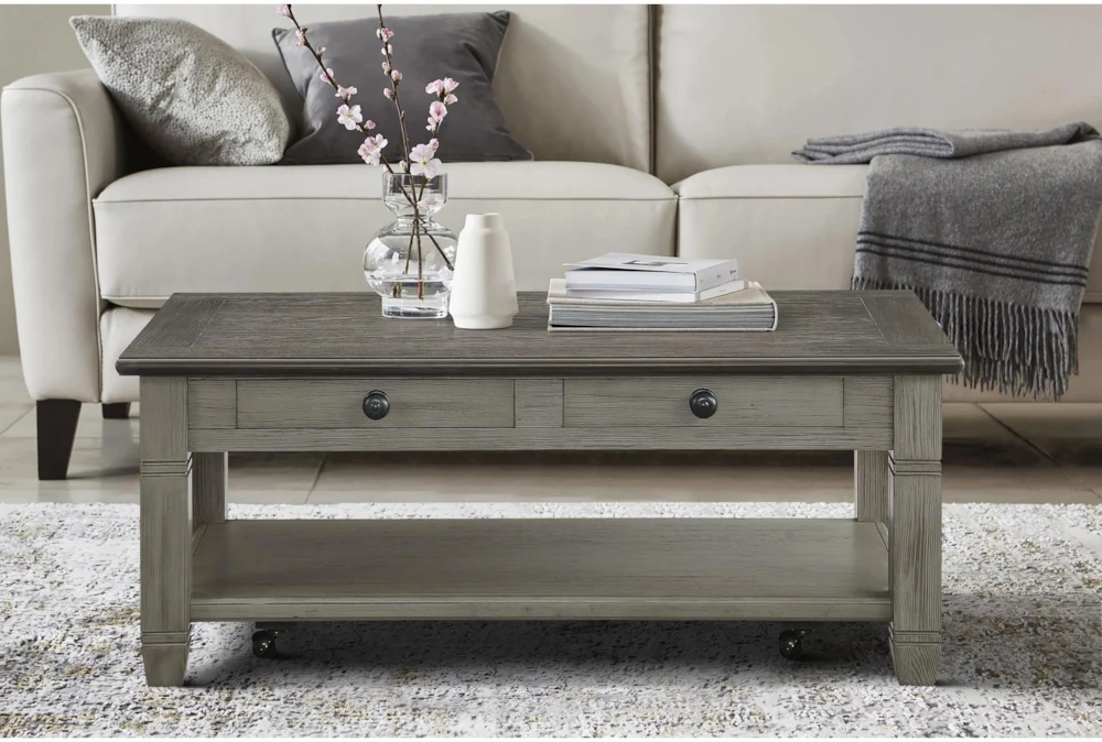This gorgeous Every Two Tone Brown/Grey Storage Coffee Table With Wheels is the perfect addition to any casual living room. Featuring ample storage with drawers and shelves, and easy mobility with casters, this table is both functional and stylish. – Provides plenty of storage space- Drawers and shelves are perfect for organizing items- Casters make it easy to move the table around the room.