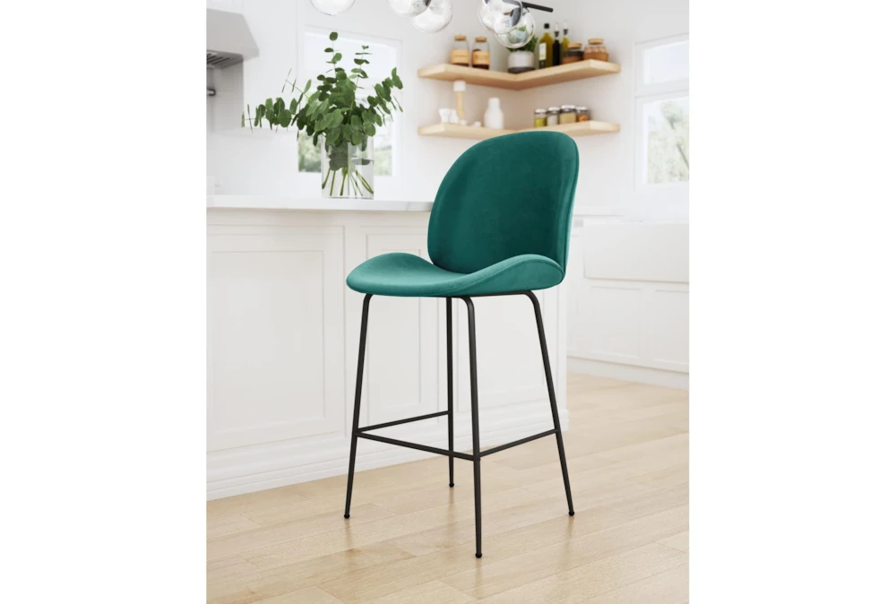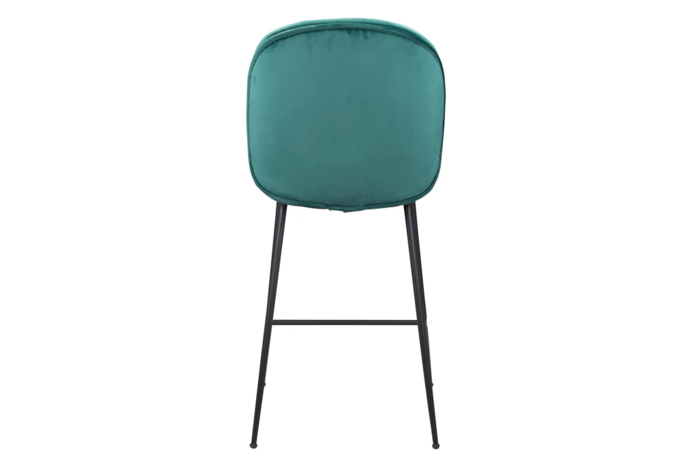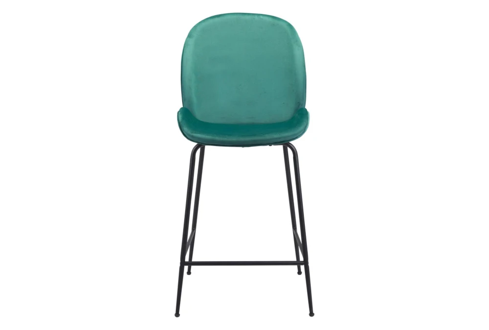 The Green Scooped Counter Stool is a modern-style metal stool with a tall, armless back and green color. Assembly is required and it features steel construction with foam and 100% polyester upholstery, seating capacity for one, and does not require hanging method.