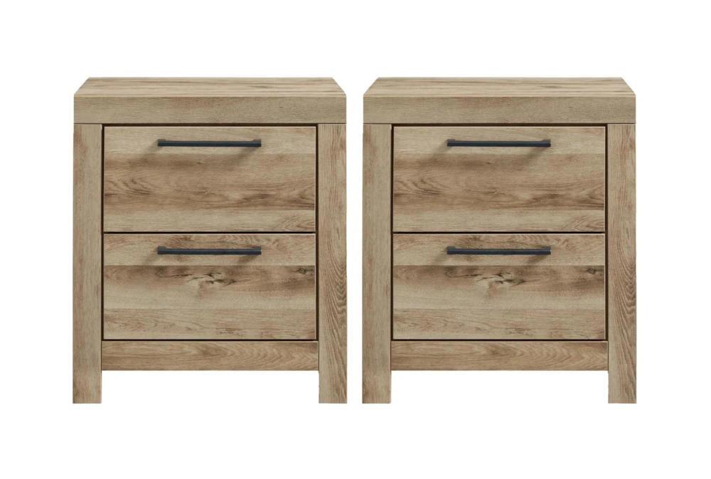 The Hyanna Nightstand with USB is a rustic piece of furniture made of multi-media materials, perfect for your bedroom. With its narrow design, it features drawers with handles and a convenient USB port for charging your devices.