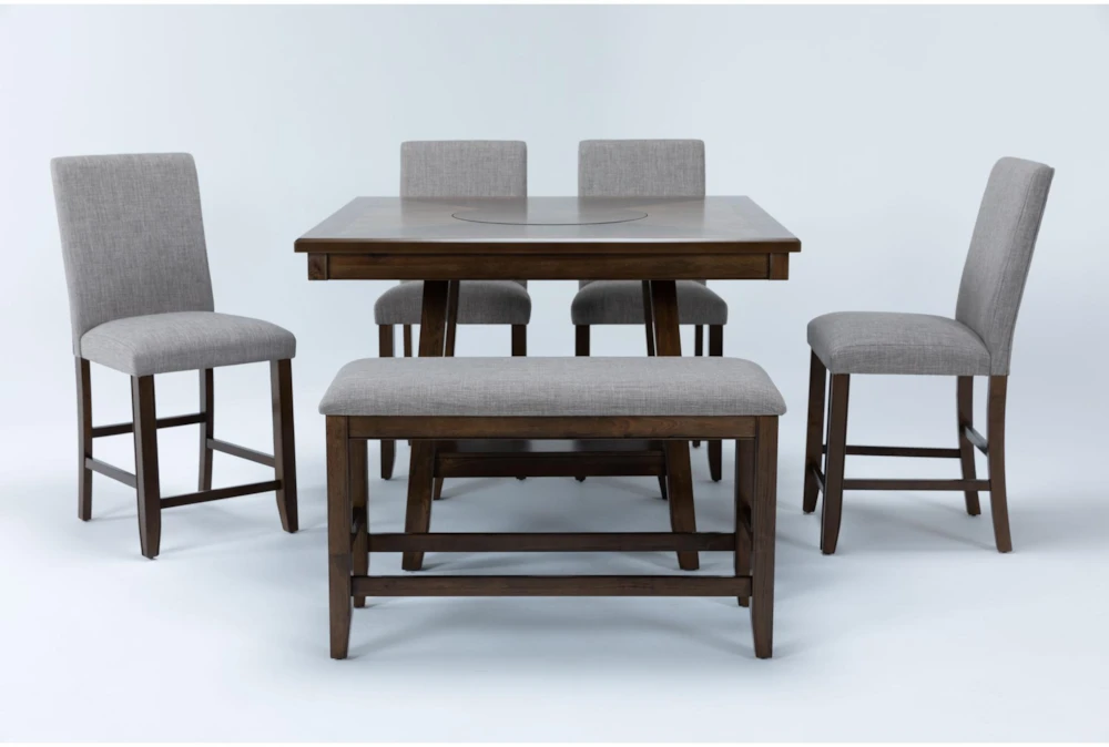 The new trend in entertaining, counter height dining reaches perfect elevation with our Hyland collection. Lofty and sturdy, this counter table features a built-in Lazy Susan for easy serving and a bottom shelf for convenient storing. You and your guests will love eating, drinking and gathering here.