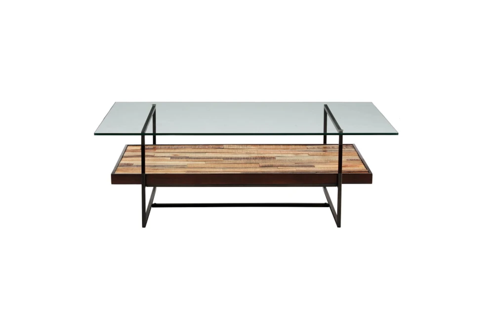 The Jakari Glass Coffee Table With Storage is a modern style piece made of solid hardwood, tempered glass, and veneer MDF, with a solid metal frame and a natural color. It features a 10mm clear glass top, storage shelves, and requires assembly.