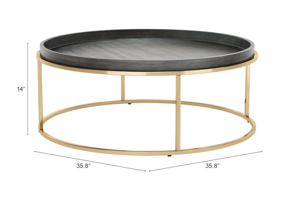Product 1 Dimensions: 35.8″ W x 35.8″ D x 14″ H; Product Materials: Iron, Mango Wood; Product Finish: Matte, Plated; Capacity: Supports up to 220 lbs; Commercial Material: Metal; Care Information: Warm water and mild soap with soft towel; Product Stackable: Not Stackable; Product Assembly: Adult Assembly Required, Tools Provided; Product Includes: includes leveller (feet stoppers)