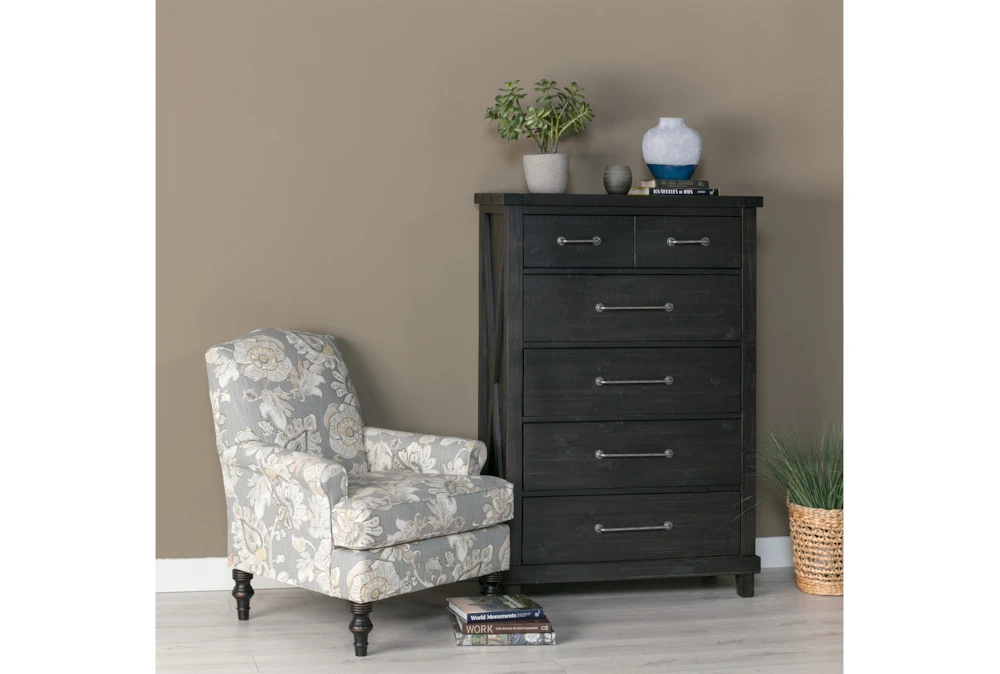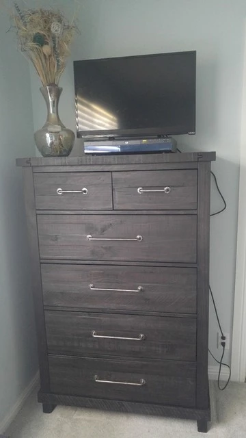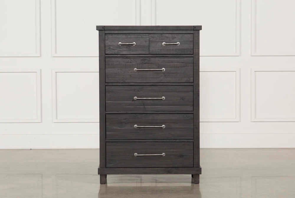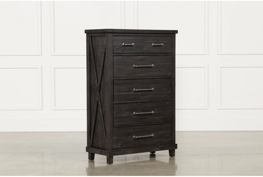 Thanks to 100% solid pine construction, the items in our Jaxon bedroom collection are truly designed by nature. The wood’s character plays a central role in the authenticity and rustic charm of this piece, from the rugged texture, to the knots, nicks, splits and imperfections that ensure it is one-of-a-kind. Decked in a dark cafe finish and distinguished by metal bolt details, the chest also boasts hammered pewter pulls.