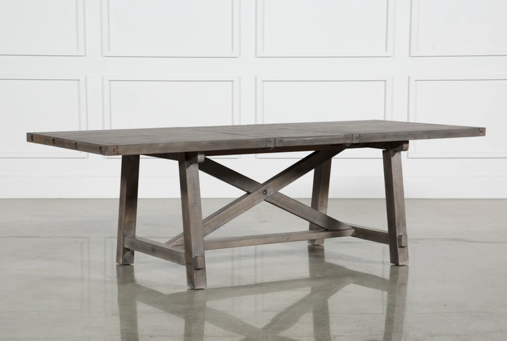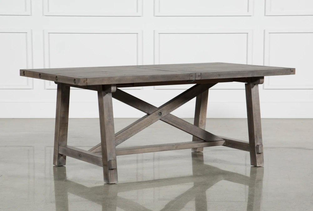 The Jaxon Grey extension rectangle dining table allows you to enjoy one of our most popular rustic styles in a brand new grey finish. Distinguished by all natural 100% solid pine construction, this design offers fresh color, unique texture and rugged character that will enrich your meals. The sturdy centerpiece features a classic trestle base, metal bolt detail and a 20� extension leaf, so you can expand your guest list.