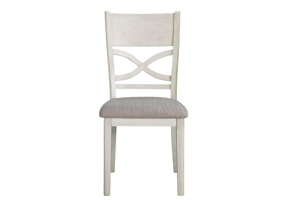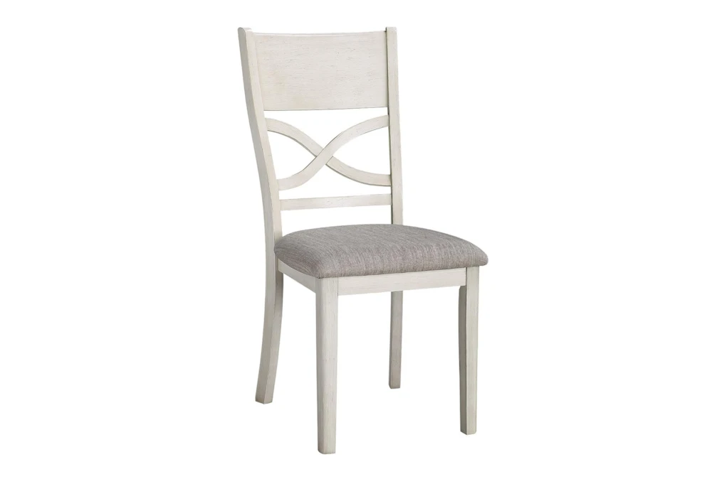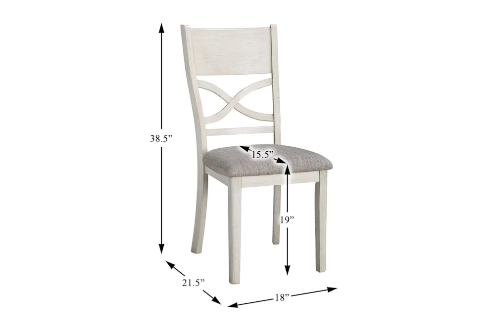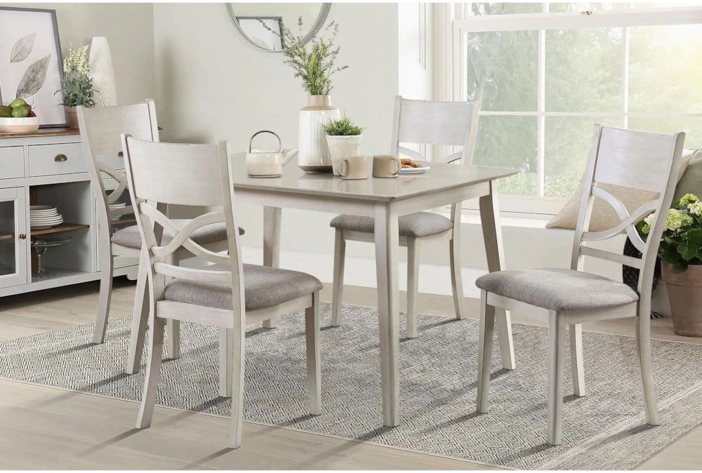 The Josie White Dining Set is a 5-piece casual style set made of wood and fabric, with an antique white finish and acacia veneer. Assembly is required for this set, which includes four chairs with cushion and slat back design.