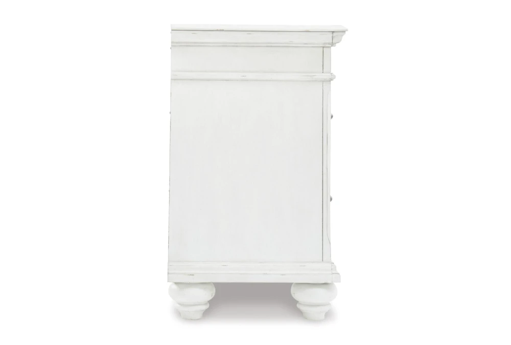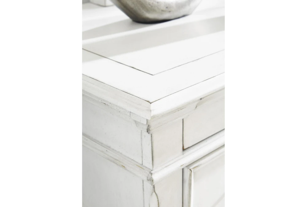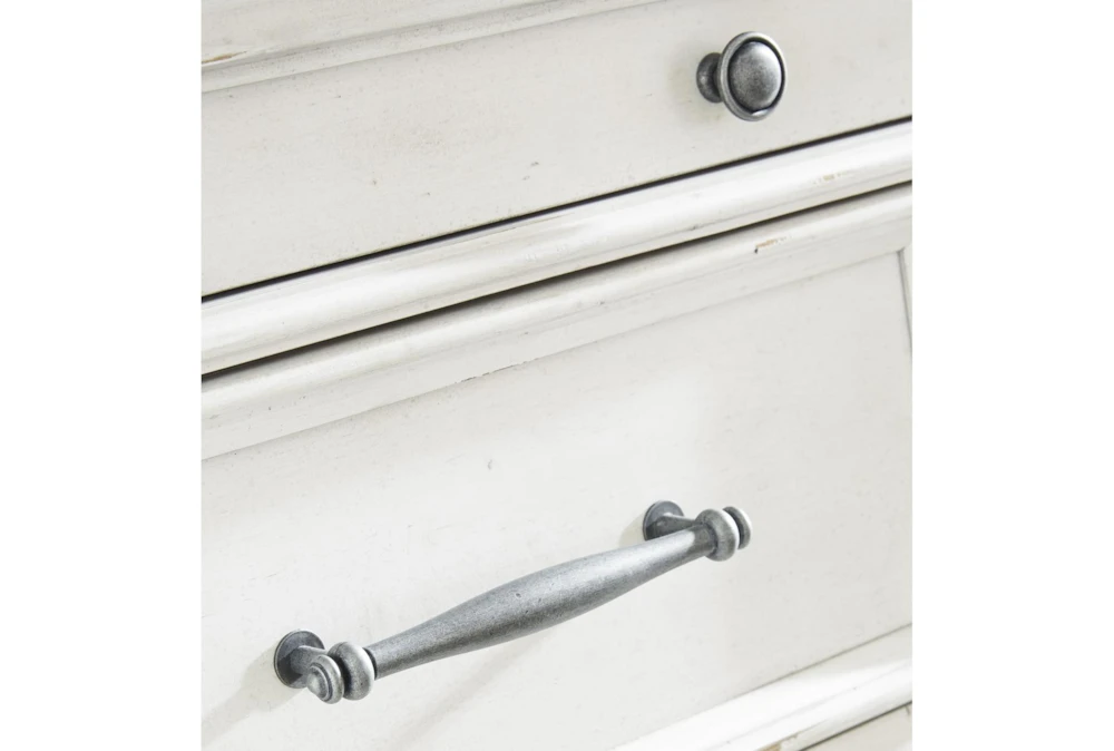 Made with veneers and select hardwood solids in a distressed whitewashed finish. Design features updated traditional styling with generously scaled moulding details. Ball bearing side glides. Hardware has a transitional aesthetic and is finished in a dark gray pewter color.