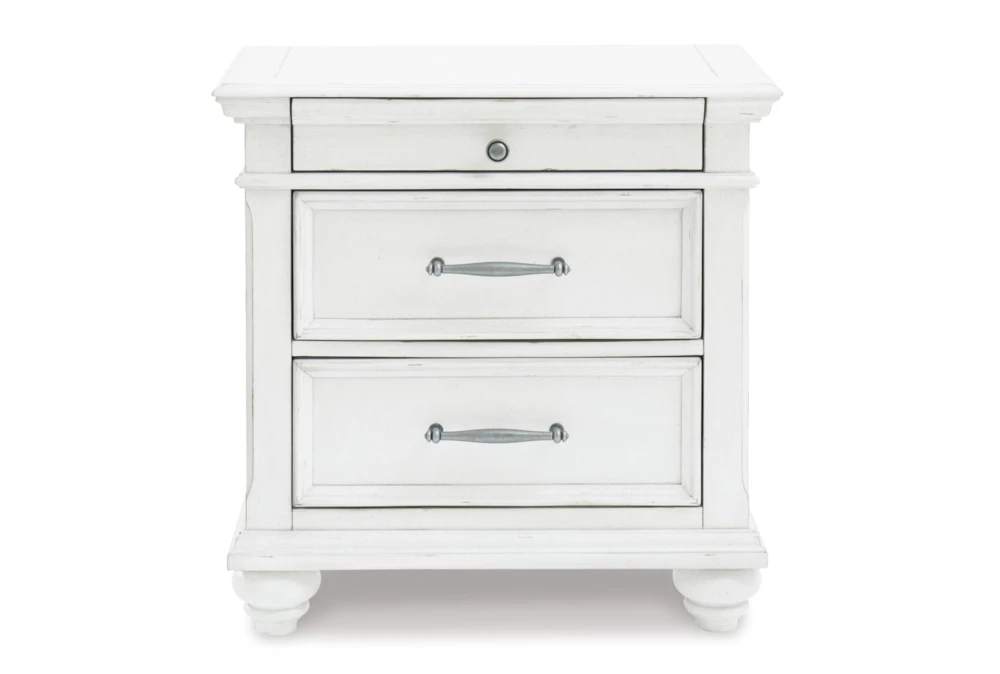 The Kailey White Nightstand features two drawers and traditional style, made with solid hardwood, engineered wood, and resin for durability. Dark gray pewter-tone finished metal hardware accentuates the white color, and the nightstand requires assembly.