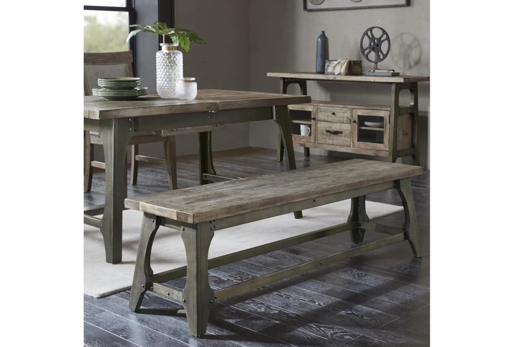 The Kayden 59″ Bench is an industrial-style backless bench made of weathered grey industrial pine panels and a metal decorative bracket with antique bronze finish. Assembly is required for this dining room piece, which also features rubber wood legs.