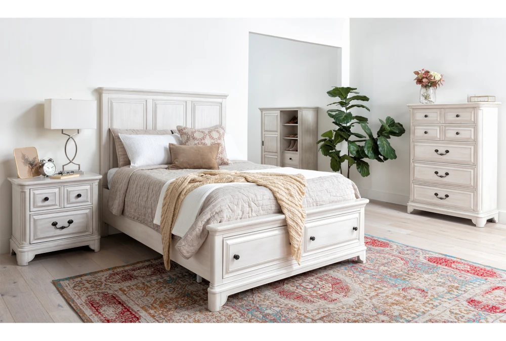 A new addition to our Kincaid collection, this storage bed’s construction reflects a fresh take on tradition. Decked in a charming weathered white finish, the sturdy, stately hardwood and veneer design features a paneled headboard and footboard with classic molding detail, plus two drawers for extra convenience.