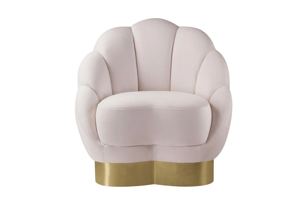 The Lotus Blush Velvet Accent Chair is a contemporary armless chair, handcrafted by skilled furniture artisans with a unique and glamorous silhouette, featuring a curved gold stainless steel base, 100% polyester blush velvet material, and a high density foam cushion for long lasting support and comfort. Care instructions are included, and this chair is perfect for any living room looking to make a stylish statement.