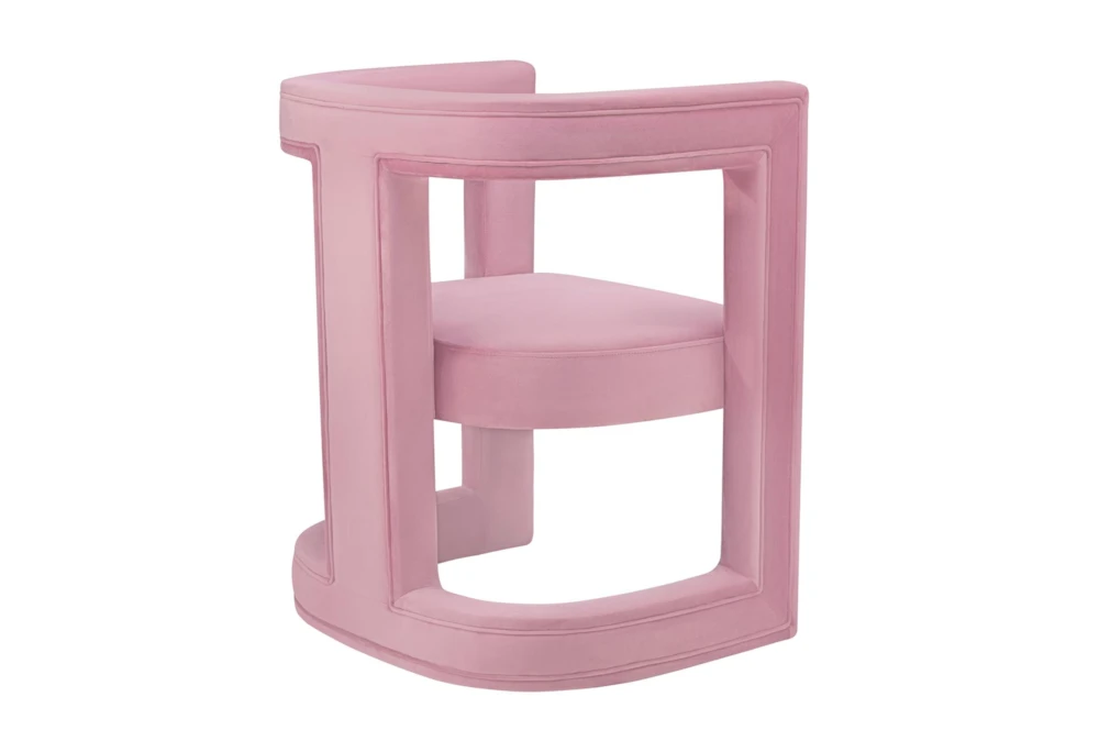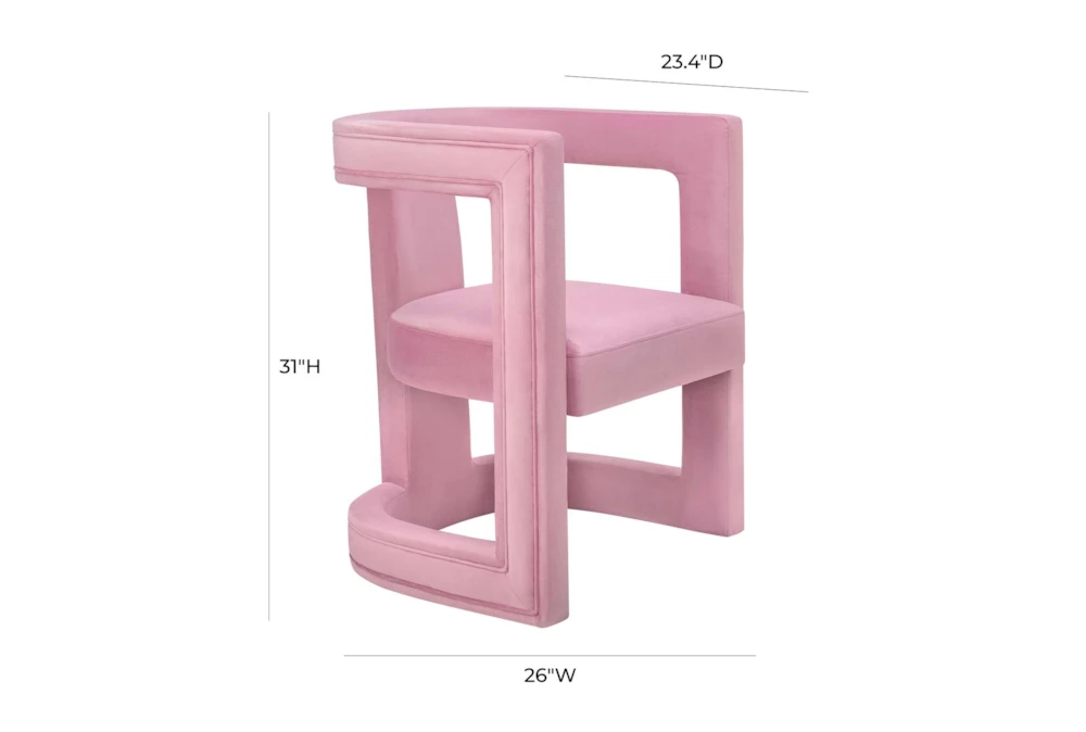 The Montgomery Pink Velvet Accent Chair is a modern piece of furniture with a curved, track-arm design, tight back, and sumptuous velvet upholstery in a pink color. Handmade by skilled furniture craftsmen, this fully assembled chair features a sculpted frame made from birch and upholstered legs, making it a stylish addition to any living room or bedroom.
