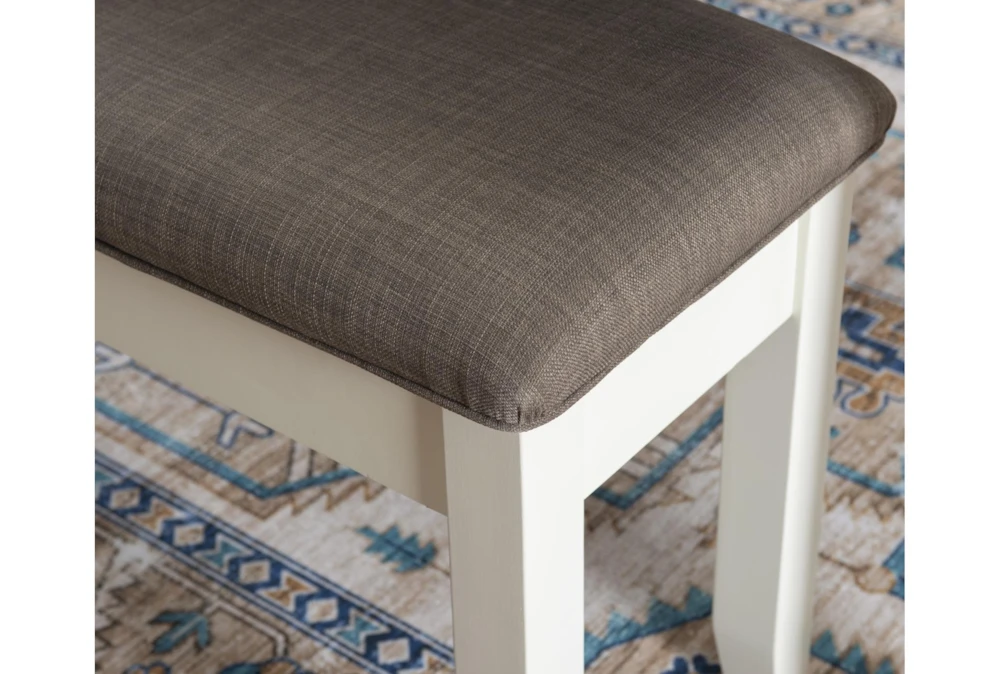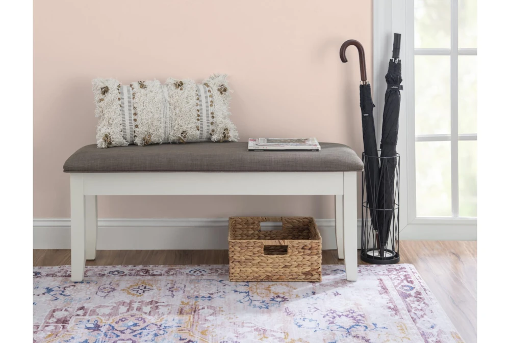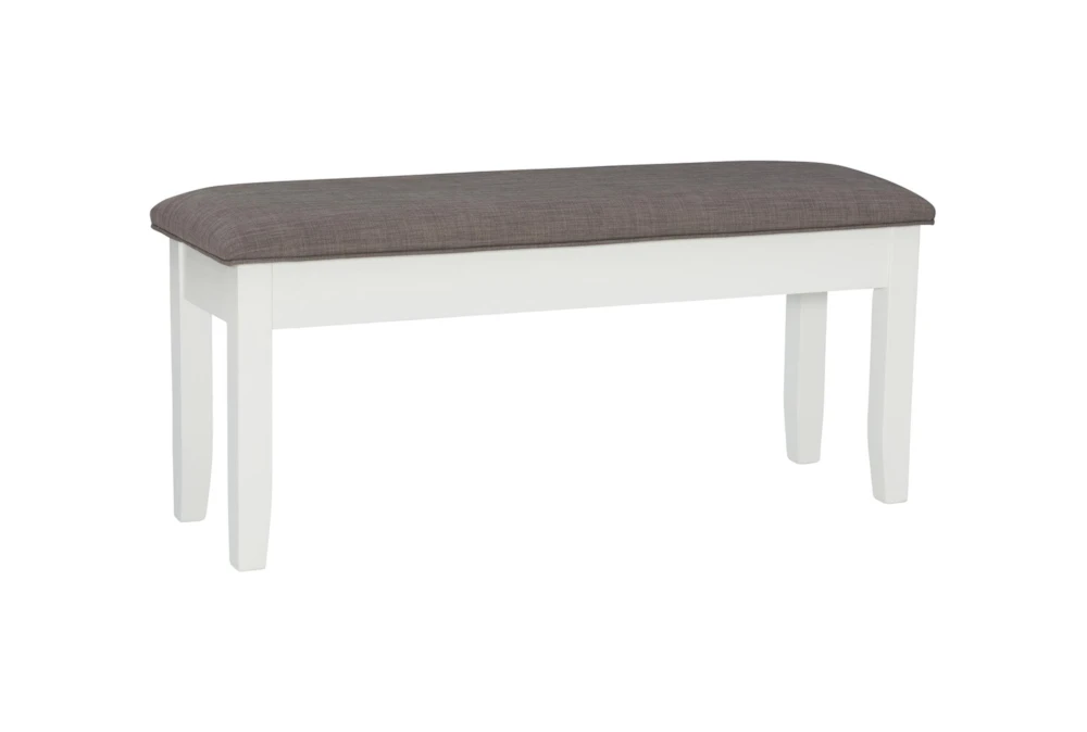 The Morgan Taupe Dining Storage Bench is a casual style bench made of wood and metal, featuring a white color and storage capabilities. The bench requires assembly and is made of 60% solid wood, 35% MDF, and 5% hardware.