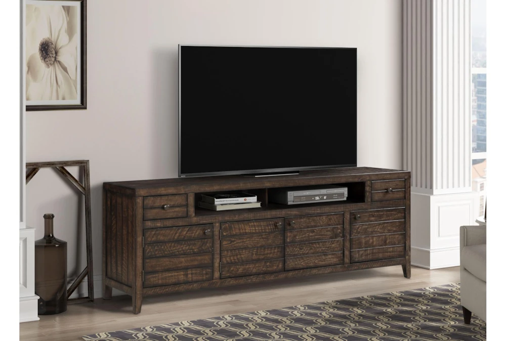 The Peoria Tobacco 84″ TV Stand is a rustic style product made of wood and is designed for your living room. It features storage, drawers, doors, adjustable shelves and a soundbar shelf, with solid pine planks, pine solids, and birch veneers, dovetail construction, a multi-step long-lasting finish, slots in back panel designed for ventilation and cord management, wood doors with adjustable shelves behind for concealed storage, and a soundbar opening designed to accommodate the latest technology.