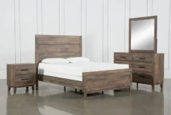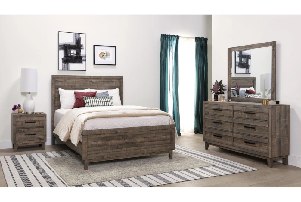 Wake up in a modern rustic retreat with the Ranier 4-piece queen bedroom set. Constructed from composite wood-look materials, Ranier shines with a laminate mahogany finish that mimics the grooves and dimension of real wood grain. Style this piece with your favorite accents and decor to get a nature-made bedroom aesthetic at an amazing value.