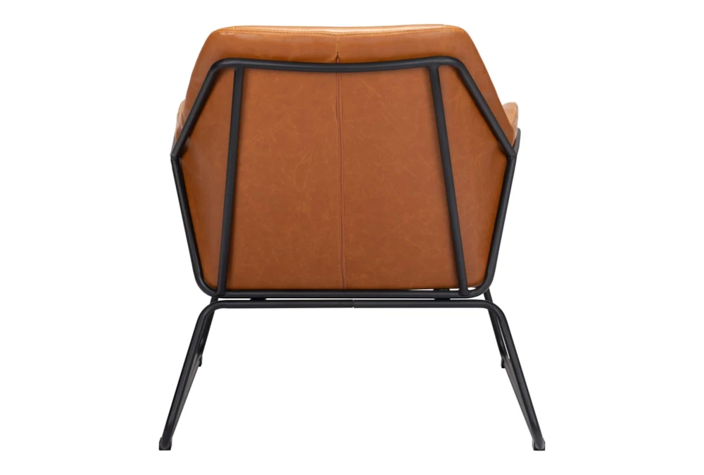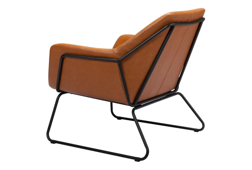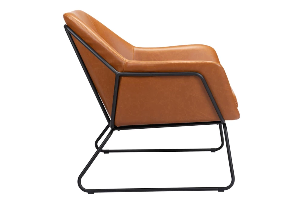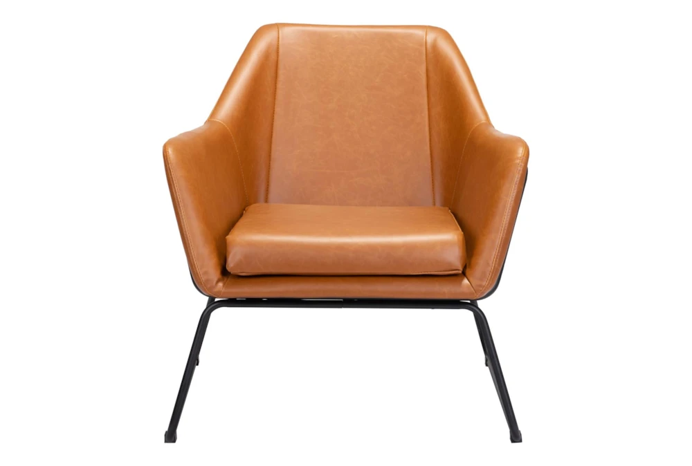 The Rayes Cognac Faux Leather Accent Chair is a modern style indoor chair made of polyurethane material in a brown color, with foam cushions, a tight back, arms, and a cushioned back. Assembly is required and care instructions are provided, with other properties including faux leather, a tan color, steel and plywood construction, and the ability to support up to 330 lbs.