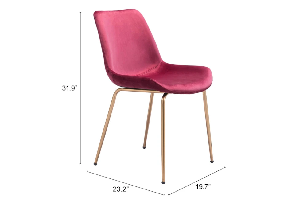 This dining chair set includes two modern-style metal chairs with red velvet seats, perfect for a dining room. Assembly is required and each chair measures 19.7″ W x 23.2″ D x 31.9″ H, with a steel frame and foam padding covered in 100% polyester velvet.