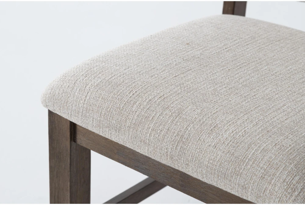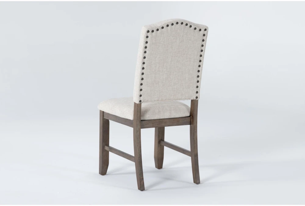 The Regent Dining Chair is a rustic-style chair with a cushion that comes in a grey color. It is made of rubberwood with linen upholstery and antique grey wood accents. The chair also features nail head trim for added detail.