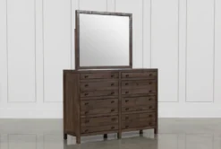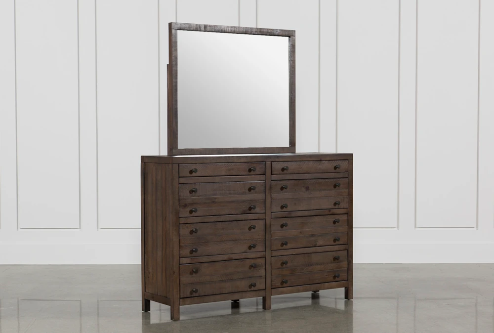 Vintage printmaker’s cabinets are the inspiration behind our handsome eight-drawer Rowan dresser/mirror. Rough-hewn solid pine construction, charming planked detail and rustic bronze hardware instill heirloom character. Uniquely designed drawers like the kind used for organizing maps, plans and blueprints have been reimagined for bedroom use. The two narrow top drawers include felt-lined inserts that provide a soft spot for jewelry.