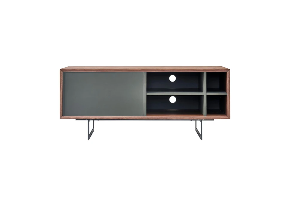 This Scottsdale Walnut and Grey 48″ TV Stand is a contemporary piece made of American walnut veneered wood, perfect for small living spaces. It features storage doors, shelves, cord management, and a soundbar shelf, all requiring assembly.