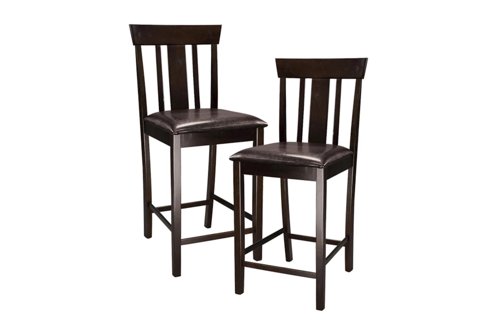 The Sedley Espresso Counter Height Chair Set of 2 is a rustic addition to your dining room, featuring solid wood construction and faux leather cushions with a back for added comfort. Assembly is required for these tall chairs, which come in a rich espresso color and are sold as a set of two.