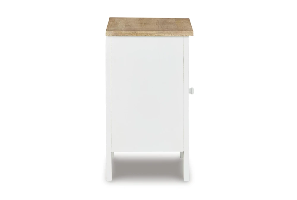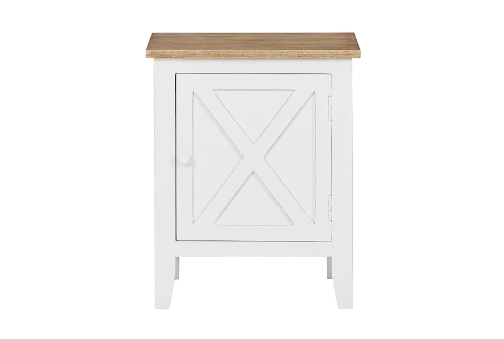 Made of solid and engineered wood in brown and cream finishes. Crossbuck door front. Wood door pull. 1 door and 1 shelf.