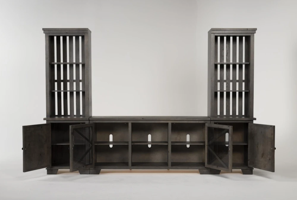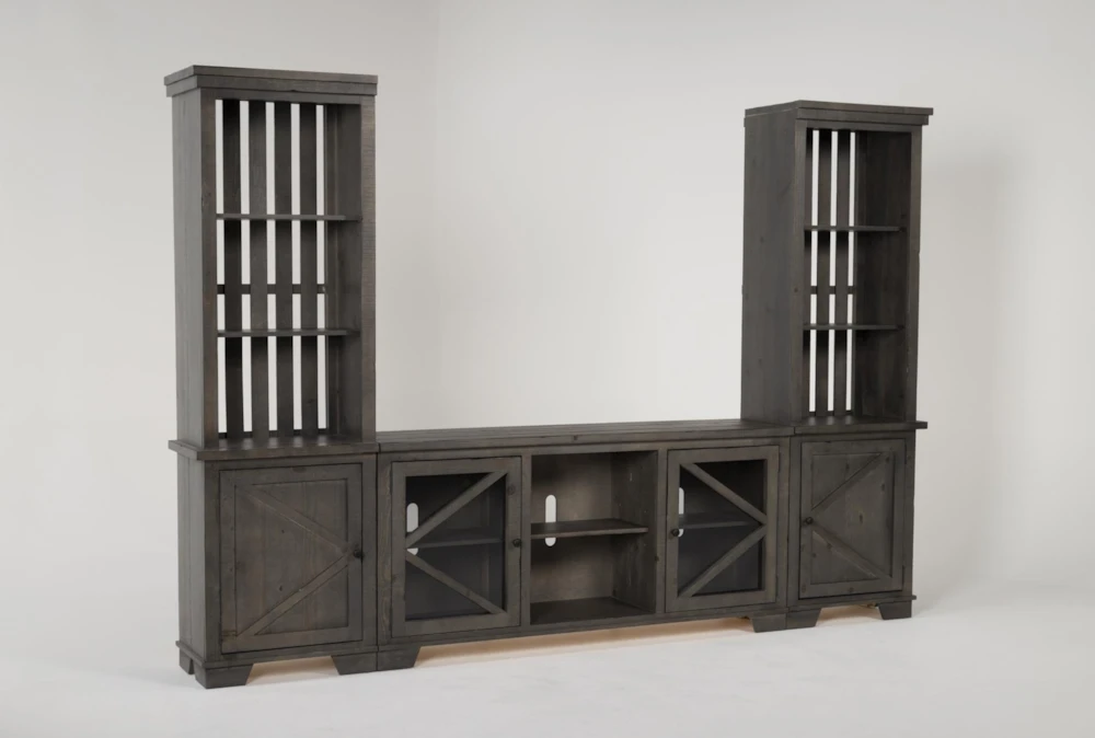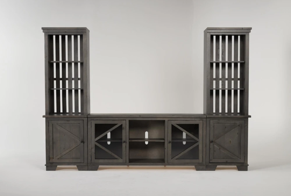 Distinguished by ruggedly handsome solid pine construction, our popular Sinclair entertainment centers are now available in a textured grey finish. This 3-piece version includes a 68” TV stand and 2 storage piers for displaying decorative accents. Whatever is on television won’t be the only feature presentation thanks to this design’s rustic charm.