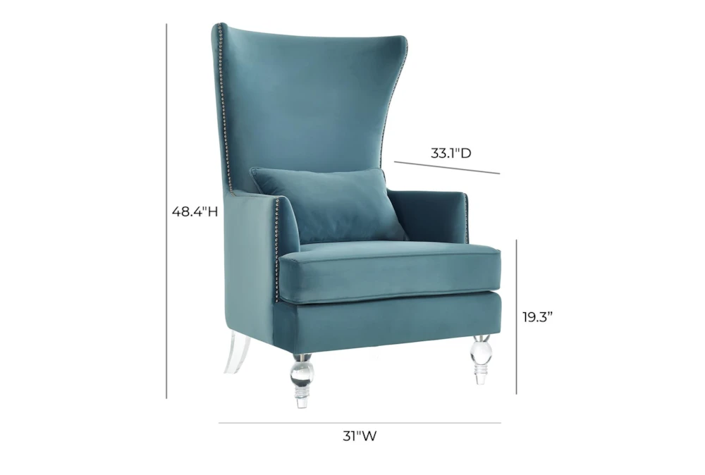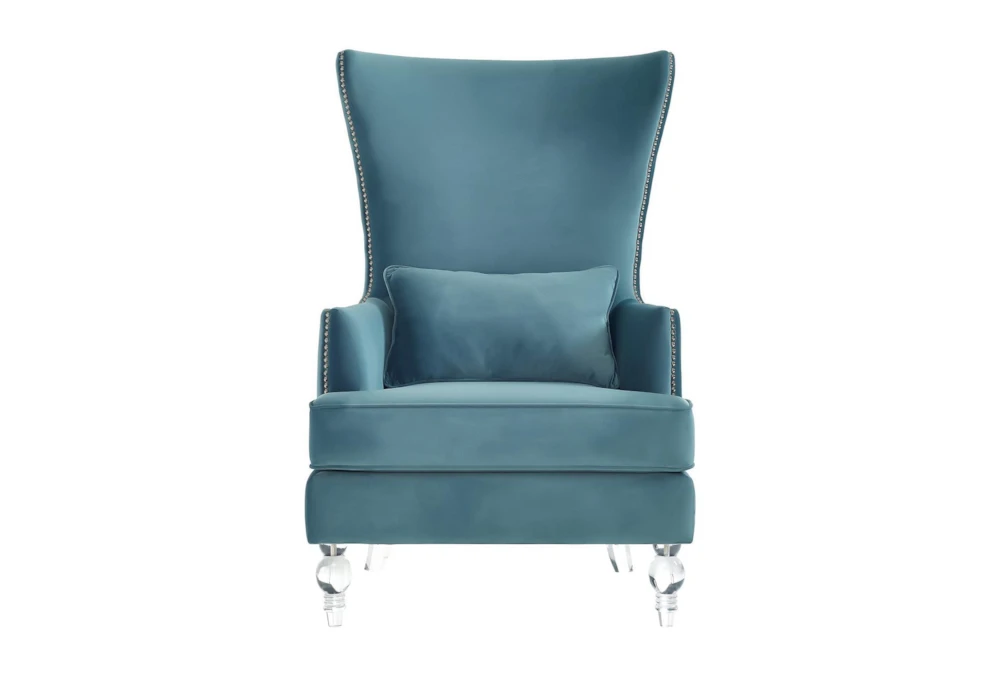 Bring a touch of contemporary elegance to your living room or bedroom with the Talia Sea Blue Highback Accent Chair. Featuring stylish nailhead detailing, comfortable wingback design and sturdy acrylic legs, this chair is the perfect addition to any modern home.