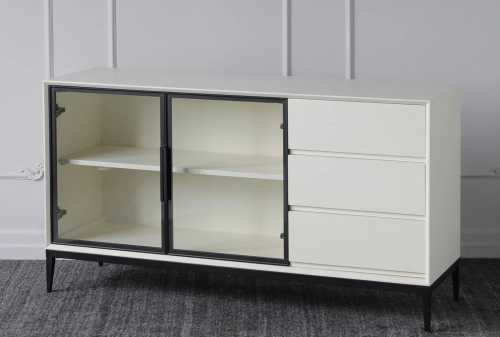 This modern White 3 Drawer 2 Door Sideboard is crafted from wood and features glass and metal accents. It offers ample storage, with 3 drawers, shelves, and both solid and glass doors, making it the perfect addition to any contemporary interior.