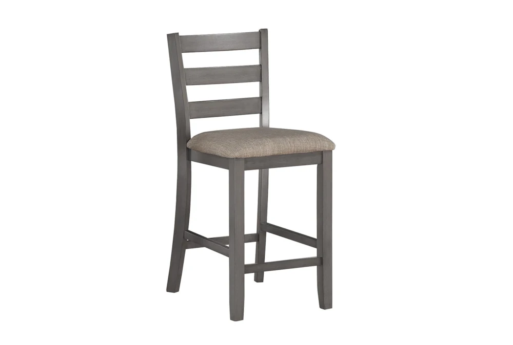 The Willy Counter Set for 4 is a stylish and functional addition to any dining room, with its tall design, slat back chairs, and convenient storage. Made of wood and dolomite, this casual set includes a counter height table with a fixed shelf and four armless chairs upholstered in fabric and foam. Assembly is required for this grey set, which features a mix of Asian hardwood and engineered wood.