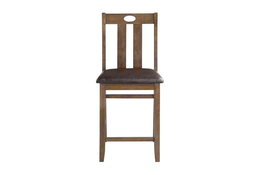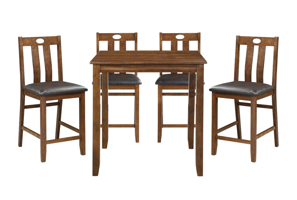The Zally Counter Set for 4 features a tall, slat back design perfect for a casual dining room. Made of wood with faux leather accents, this set includes a counter height table and 4 chairs that comfortably seat 4.